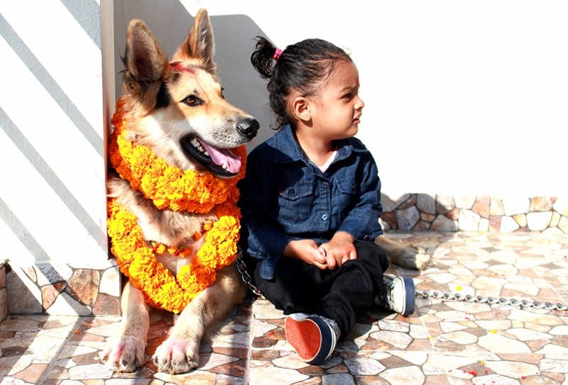 During Kukur Tihar, dogs are adorned with flower garlands (mallas) and marked with tilaka, a ceremonial red mark made from a mixture of kumkuma (red dye), rice, and yogurt on their foreheads. This act signifies respect and reverence towards them. Worshippers offer various foods such as meat, milk, eggs, and specially prepared dog food to express gratitude for the companionship that dogs provide.
