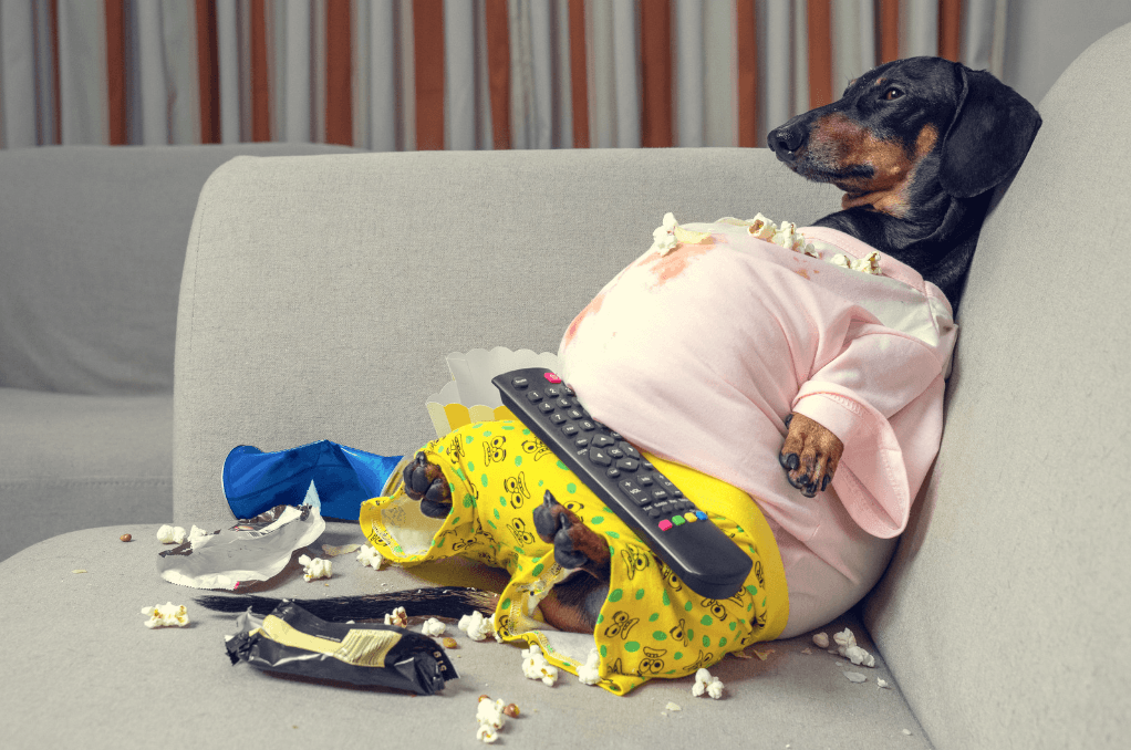 Overweight dogs are typically inactive and eat quickly. If your dog has become a couch potato, has trouble walking, exhibits trouble breathing when walking, and generally appears to have trouble moving about, they might be fat.